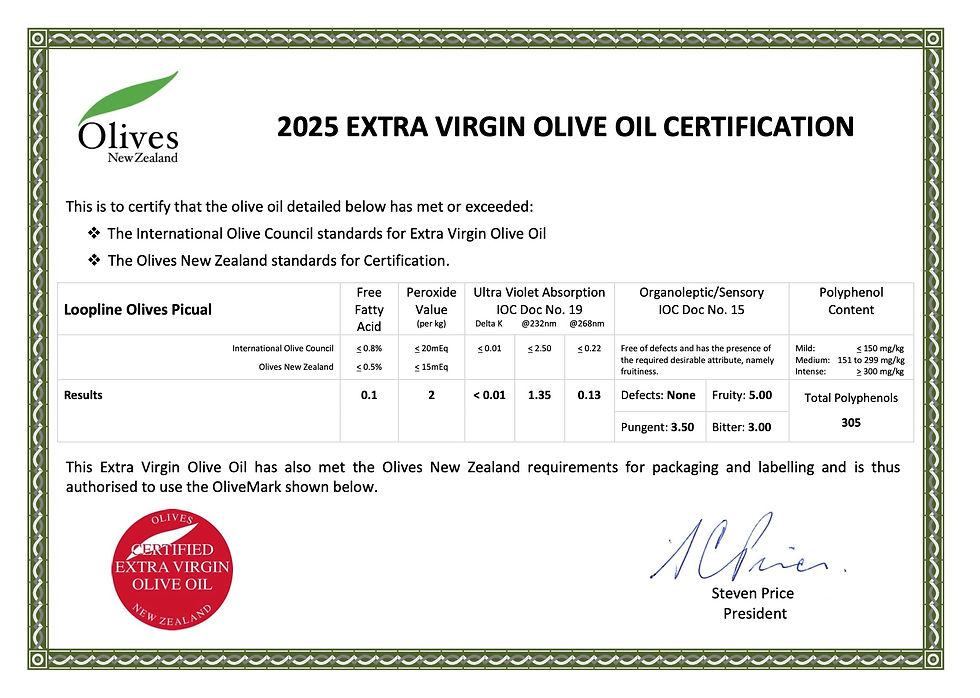 Loopline Olives Picual presents fresh green leaves, freshly cut grass and a beautiful fruitiness on the nose with a hit of green tomatoes, well transferred to the palate with tomatoes, spices, herbs and artichoke. 2025 has delivered an intense robust oil - Total Polyphenols 305 - with well-balanced bitterness and pungency and a lingering finish with a good hit of pepper.